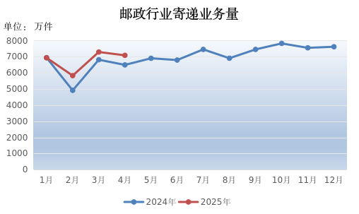 4月份,邮政行业寄递业务量完成7085.87万件,同比增长9.13%。其中,快递业务量完成3944.66万件,同比增长21.35%.