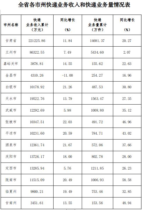1-4月,邮政行业业务收入(不包括邮政储蓄银行直接营业收入)完成32.65亿元,同比增长7.59%。其中,快递业务收入完成22.12亿元;同比增长11.84%。