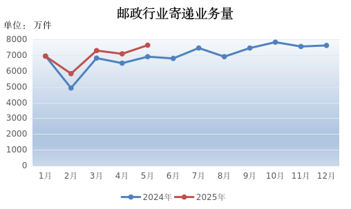 5月份,邮政行业寄递业务量完成7633.61万件,同比增长10.58%。其中,快递业务量完成4430.87万件,同比增长25.26%。