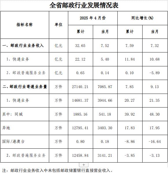 4月份,邮政行业业务收入(不包括邮政储蓄银行直接营业收入)完成7.52亿元,同比增长7.32%。其中,快递业务收入完成5.40亿元同比增长10.68%。